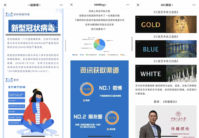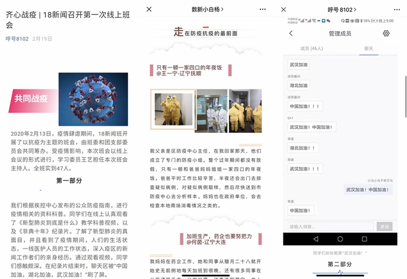 班会上,很多班级通过科普演讲视频、防疫知识问卷、宅家生活调查等方式进行防疫抗疫的宣传引导。同时,要求同学们牢记“停课不停学”,认真学习学院和老师推荐的图书、纪录片等材料,并及时分享自己的学习心得。同学们畅所欲言,互道平安,为疫情的发展牵挂揪心,也为这段时间学有所获感到高兴。大家积极发言,讨论热烈,有的班会持续了三个多小时。