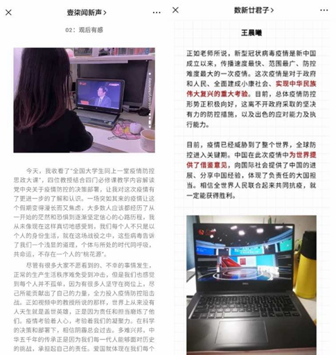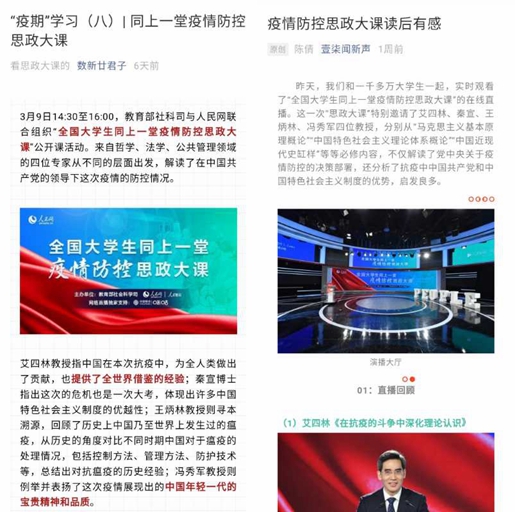直播结束后,同学们反响热烈,betway西汉姆联官网2017级新闻学(数据新闻报道方向)和2017级新闻学等班级还通过微信公众号,发表了同学们的学习体会。员工们从全国人民万众一心、携手抗疫中感受理想信念的力量;从医护人员的奉献和公民个体的自觉中明白小我与大我的关系;从中国向世界各国分享抗疫经验,提供借鉴意见看到大国的担当作为;还有同学从专业角度出发,对新闻传播和舆论导向在抗疫中的作用进行了深入思考。