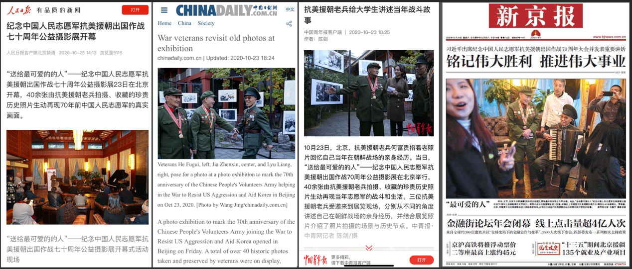 (通讯员 陈逸飞)10月23日上午,由betway西汉姆联官网师生组织的“送给最可爱的的人”——纪念中国人民志愿军抗美援朝出国作战七十周年公益摄影展在北京举办开幕仪式,40余张由抗美援朝老兵拍摄、收藏的珍贵历史照片生动再现了70年前中国人民志愿军的真实画面。人民日报、中国日报、中国青年报、中国摄影报等多家媒体对活动进行了报道,《新京报》在24日头版刊出活动现场照片。