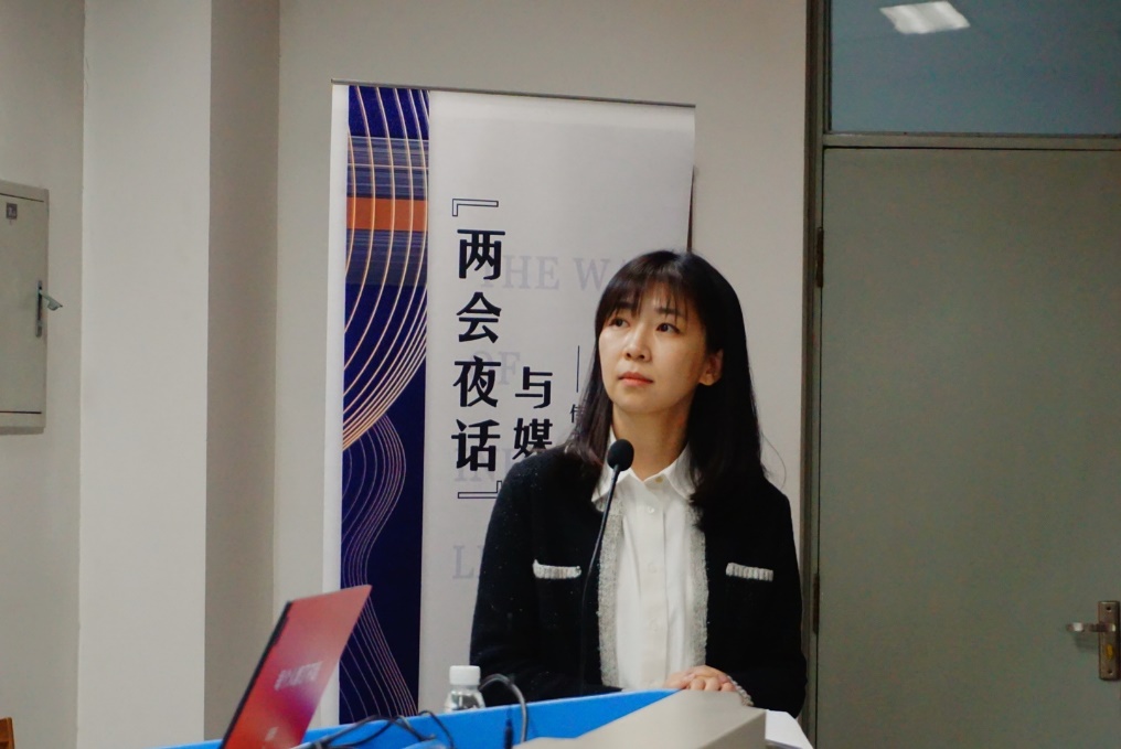 “人民网”品牌部主任赵岍向同学们介绍了制作“两会夜话”节目的背景和初心。赵岍表示,人民日报社最初作为纸媒平台,在1997年正式接入了互联网。到2021年,有着24年运营经验的人民网越来越重视青年人的参与,力图“破壁出圈”,和青年人平等对话。由此,他们打造了《两会夜话》这个节目,目的是将两会的议题真正带到青年人的身边。人民网从内部破圈,打造了富有“厂牌”特色的主理人,并选择青年主播,邀请由专家、学者、KOL、up主组成的嘉宾团队。赵岍介绍,在面对青年受众的时候,他们会尽量做到“尊重而不刻意讨好”。同时,节目兼具专业记者评论和青年人视角,准确地表达出党媒的态度。