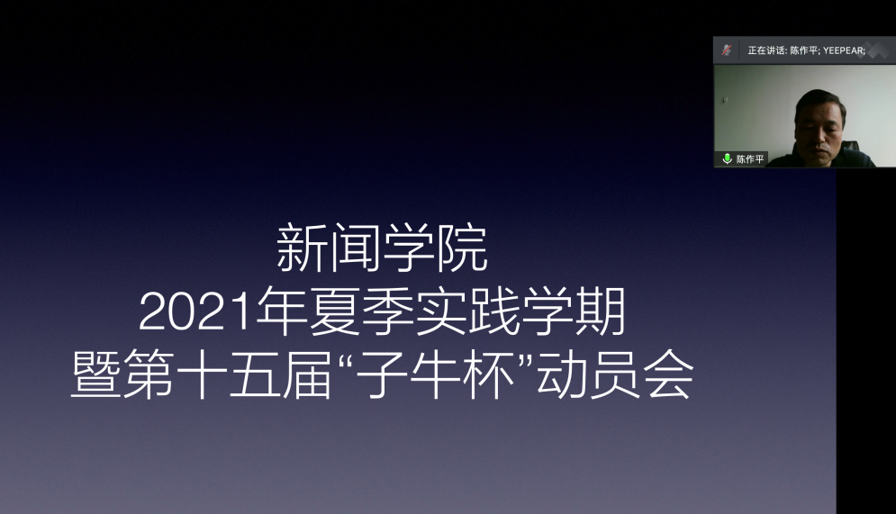陈作平书记就“子牛杯”社会调查征文大赛的历史传承进行了总结,并指出“子牛杯”给同学们提供了发挥自己的潜能的平台,以“子牛杯”为基础的作品多次在“挑战杯”等各类学术竞赛中获得优异成绩。陈作平书记希望同学们在遵守疫情防控基本要求的同时积极参与,在社会调查中提高对课堂理论学习的转化能力,增强对社会的认识,帮助自己树立正确的世界观、人生观、价值观,培养家国情怀,为未来从事新闻工作打下坚实基础。