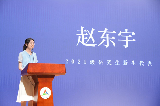 2021级新闻与传播专业全媒体新闻实务方向赵东宇同学代表研究生发言。赵东宇同学首先对新生表示了欢迎,并对老师、家长们的支持表示了感谢。赵东宇同学回顾和总结了自己本科四年的学习时光,并对自己身上的变化感慨万千。她分享了自己在四川省某贫困县支教的经历,她认为,这段经历加深了自己对新闻和新闻行业的理解,让自己认识到了新闻实践调研的重要性。回到大学成为研究生,她就好像从终点回到了起点。最后,赵东宇同学向所有新生表示了祝福,愿所有研究生新生们能够不改初心,坚守赤诚。