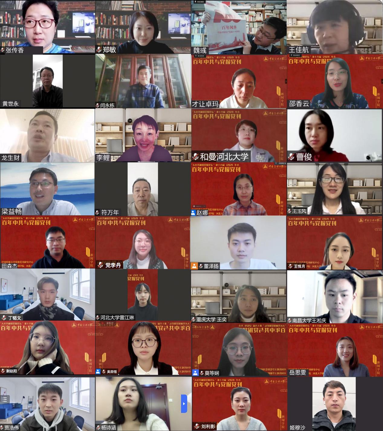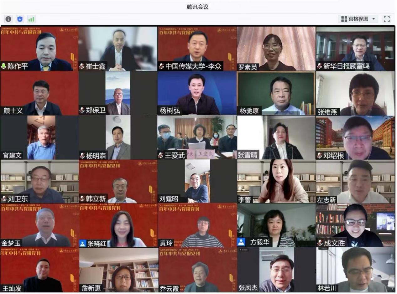 本届年会由betway西汉姆联官网党报党刊研究中心、betway西汉姆联官网与河北大学新闻传播学院联合主办,采取线上直播的形式。来自人民日报社、求是杂志社、新华日报社、北京日报社、重庆市委当代党员杂志社、传媒杂志社、新华社《中国记者》杂志等19家中央及地方党报党刊主流媒体,betway西汉姆联官网、中国人民大学、河北大学、广西大学、天津师范大学、南开大学等16所高校、科研机构以及安徽省安庆市委宣传部的嘉宾,相聚腾讯会议云端,围绕中共百年党报党刊发展、党的新闻理论与新闻思想、新时代党报党刊的创新实践以及媒体深度融合发展等议题展开交流研讨。与会代表共计80余人。