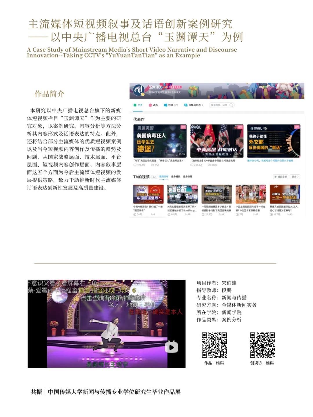 本研究以中央广播电视总台旗下的新媒体短视频栏目“玉渊谭天”作为主要的研究对象,以案例研究、内容分析等方法分析其内容形式及话语表达的特点。此外,还将结合部分主流媒体的优质短视频案例以及当今短视频内容创作及传播的趋势及问题,从国家战略层面、技术层面、平台层面、短视频内容创作层面、内容叙事层面这五个方面为今后主流媒体短视频的发展提供策略,致力于助推新时代主流媒体话语表达创新性发展及高质量建设。