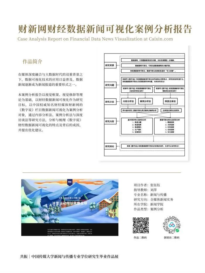 在媒体深度融合与大数据时代的双重背景之下,数据可视化技术的应用日益普及,数据新闻逐渐成为新闻报道的重要形式之一。本案例分析报告以视觉框架、视觉修辞等理论为基础,以财经数据新闻可视化作为研究目标,以中国权威知名财经媒体财新网的《数字说》栏目数据新闻可视化为案例分析对象,通过内容分析法、案例分析法与深度访谈法等研究方法,分析与梳理《数字说》财经数据新闻可视化的特点及背后的成因,并提出优化建议。