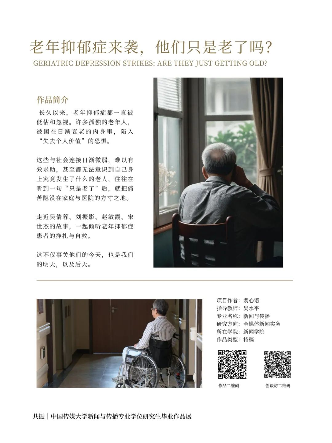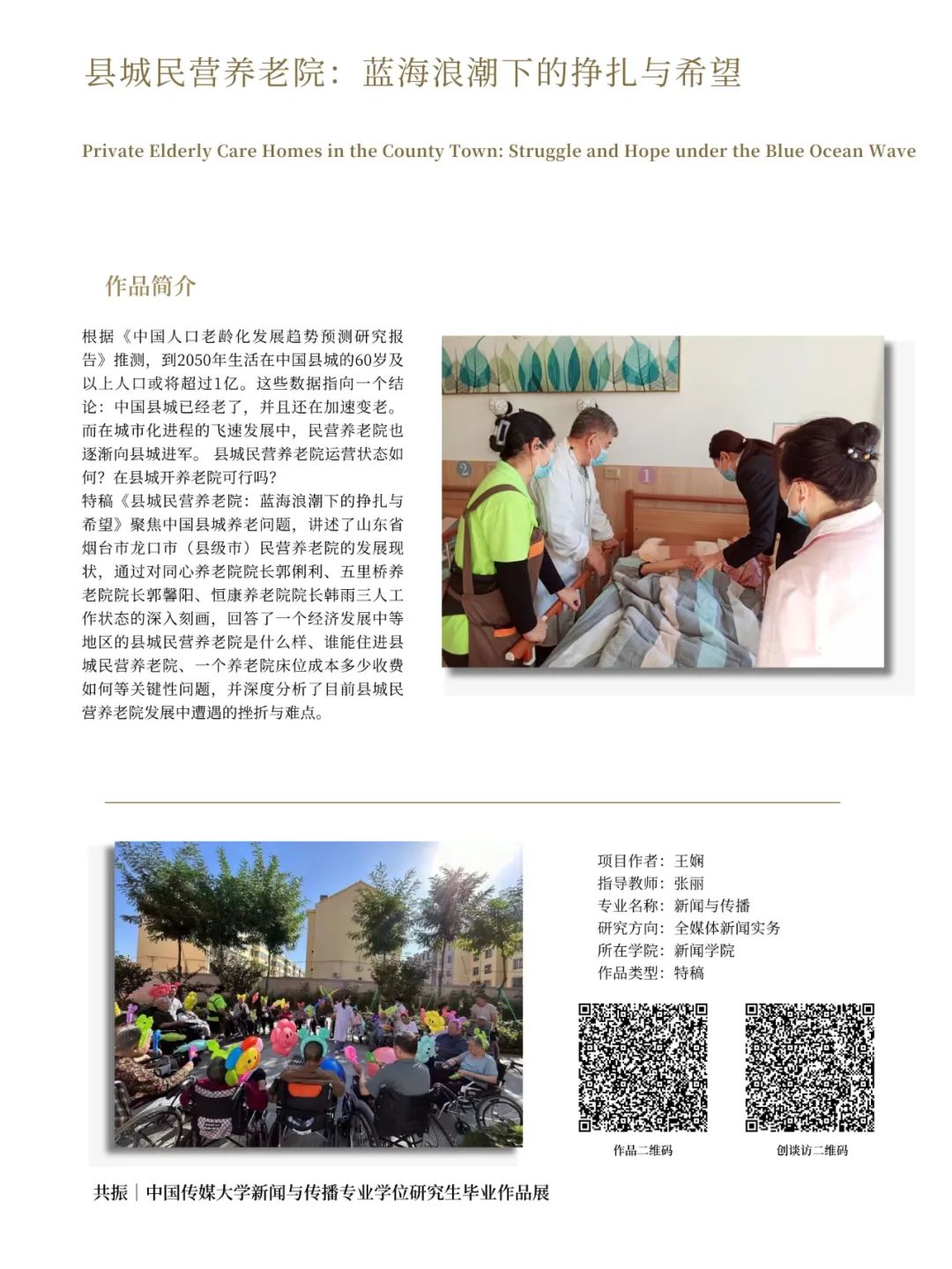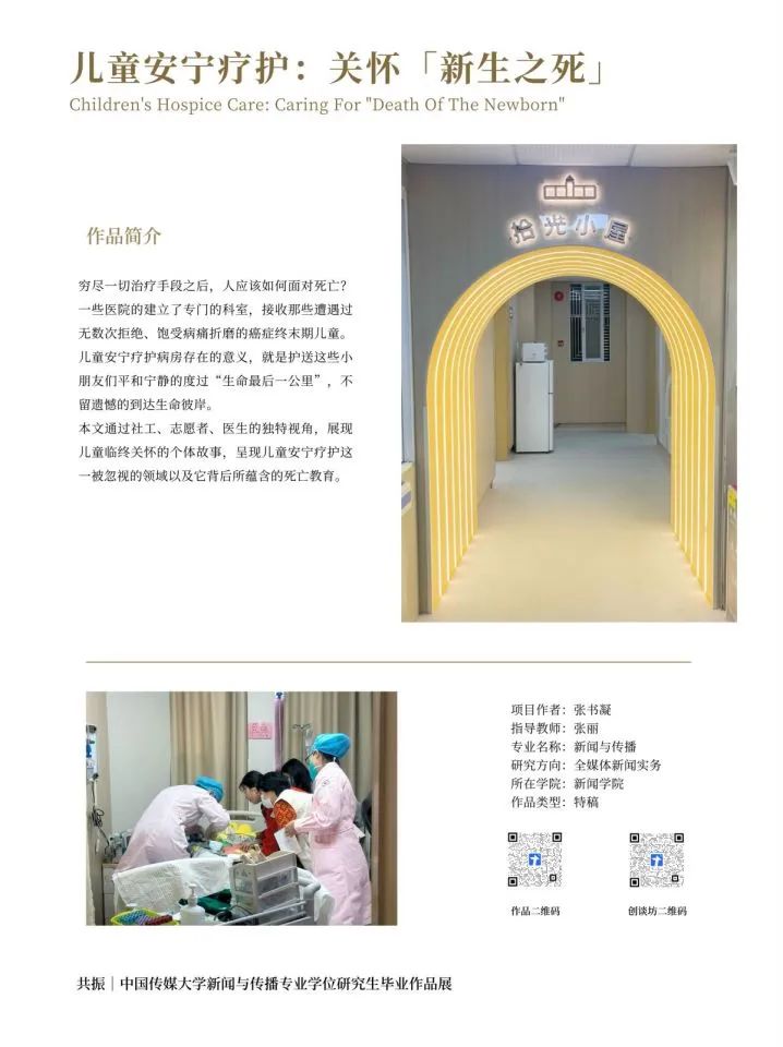 作品围绕越来越多年轻人订立遗嘱这一社会现象展开,通过展现订立遗嘱的年轻人的故事,呈现了年轻人遗嘱中的内容、年轻人订立遗嘱的原因以及订立遗嘱这一事件对年轻人的生活产生的影响。在遗嘱中,年轻人梳理了他们最珍视的人和事,也带着爱与责任,对这些人和事进行了妥善的安排。订立遗嘱之后,年轻人重新认识了自己的过去,并以此为起点,迎接新生。穷尽一切治疗手段之后,人应该如何面对死亡?一些医院的建立了专门的科室,接收那些遭遇过无数次拒绝、饱受病痛折磨的癌症终末期儿童。儿童安宁疗护病房存在的意义,就是护送这些小朋友们平和宁静的度过“生命最后一公里”,不留遗憾的到达生命彼岸。本文通过工、志愿者、医生的独特视角展现儿童临终关怀的个体故事,呈现儿童安宁疗护这一被忽视的领域以及它背后所蕴含的死亡教育。该作品聚焦中国县城养老问题,讲述了山东省烟台市龙口市(县级市)民营养老院的发展现状,通过对同心养老院经理郭俐利、五里桥养老院经理郭馨阳、恒康养老院经理韩雨三人工作状态的深入刻画,回答了一个经济发展中等地区的县城民营养老院是什么样、谁能住进县城民营养老院、一个养老院床位成本多少收费如何等关键性问题,并深度分析了目前县城民营养老院发展中遭遇的挫折与难点。