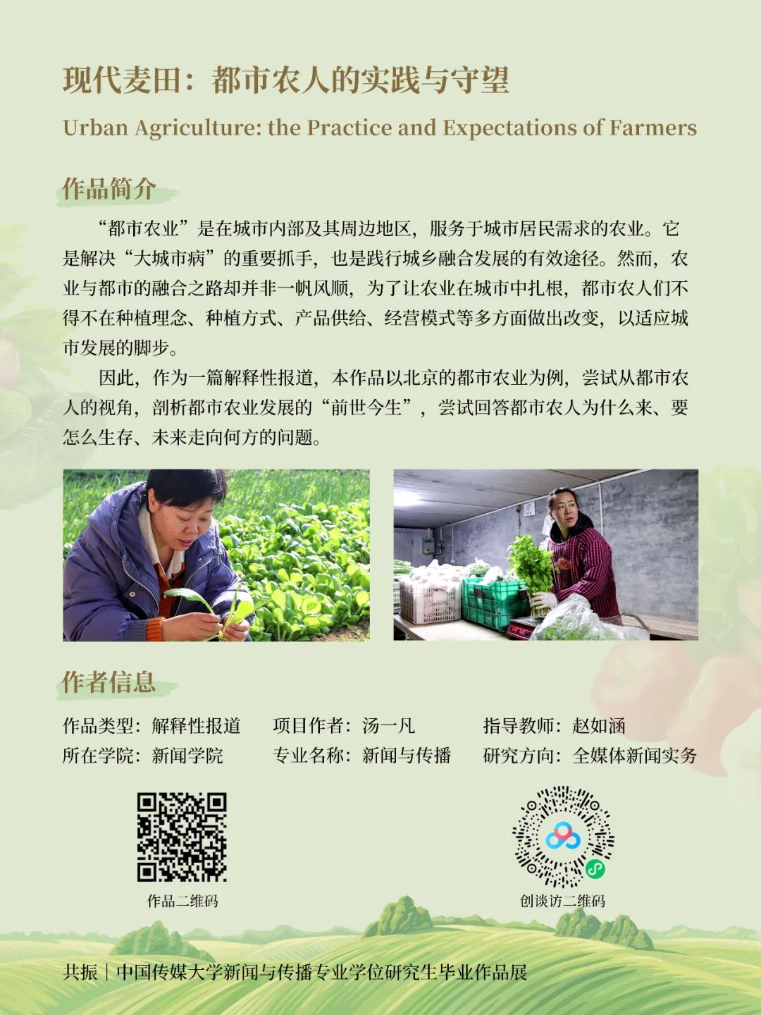 “都市农业”是在城市内部及其周边地区服务于城市居民需求的农业。它是实现城乡融合发展的重要途径。然而,农业与都市的融合之路却并非一帆风顺,为了让农业在城市中扎根,都市农人们不得不在种植理念与方式、产品供给与经营等多方面做出调整,以适应城市发展的脚步。因此作为一篇解释性报道,本作品以北京都市农业为例,从都市农人的视角剖析都市农业发展的前世今生,尝试回答都市农人为什么来、要怎么生存、未来走向何方的问题。