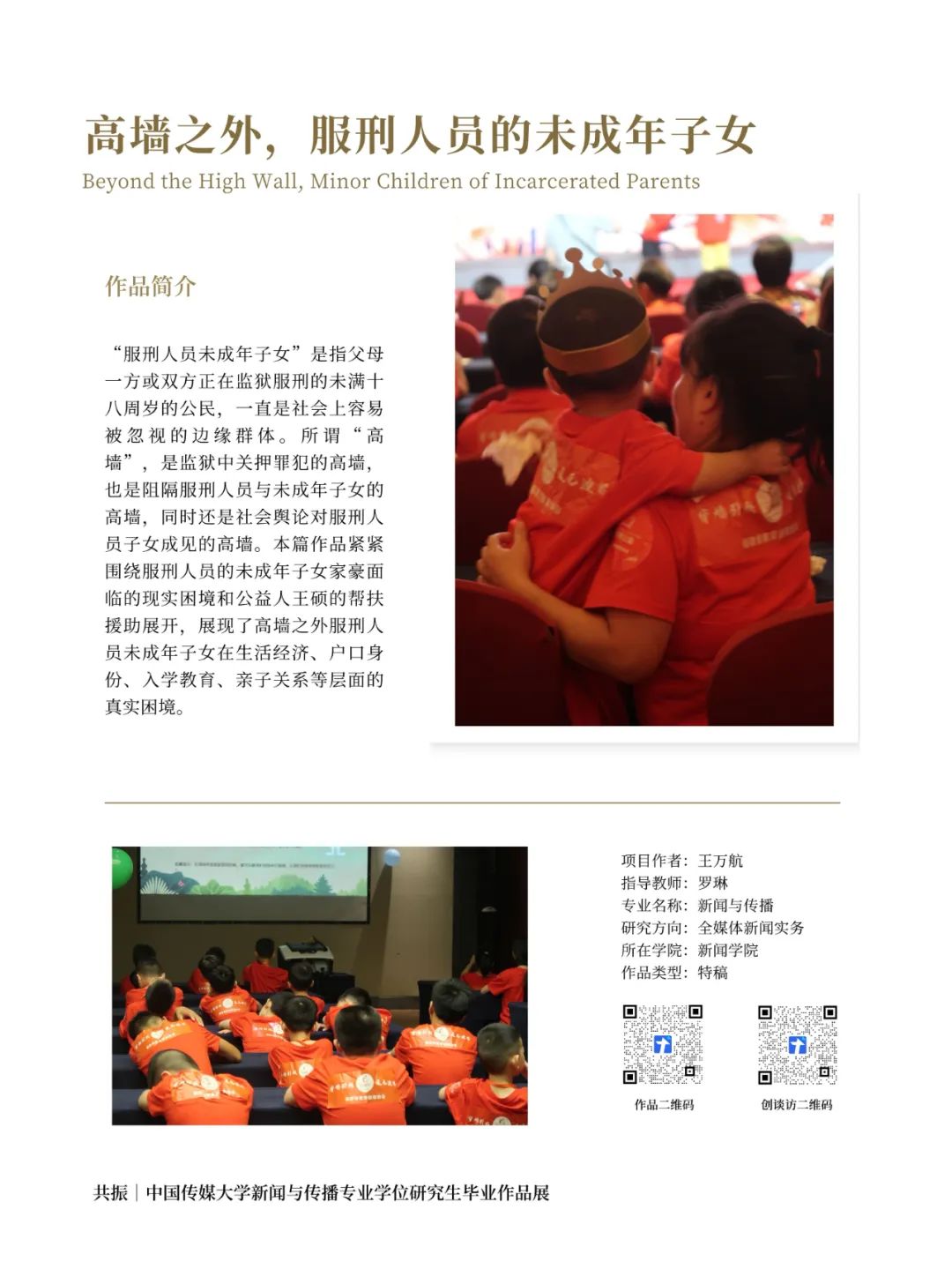 “服刑人员未成年子女”是指父母一方或双方正在监狱服刑的未满十八周岁的公民,一直是社会上容易被忽视的边缘群体。所谓“高墙”,是监狱中关押罪犯的高墙,也是阻隔服刑人员与未成年子女的高墙,同时还是社会舆论对服刑人员子女成见的高墙。本篇作品紧紧围绕服刑人员的未成年子女家豪面临的现实困境和公益人王硕的帮扶援助展开,展现了高墙之外服刑人员未成年子女在生活经济、户口身份、入学教育、亲子关系等层面的真实困境。