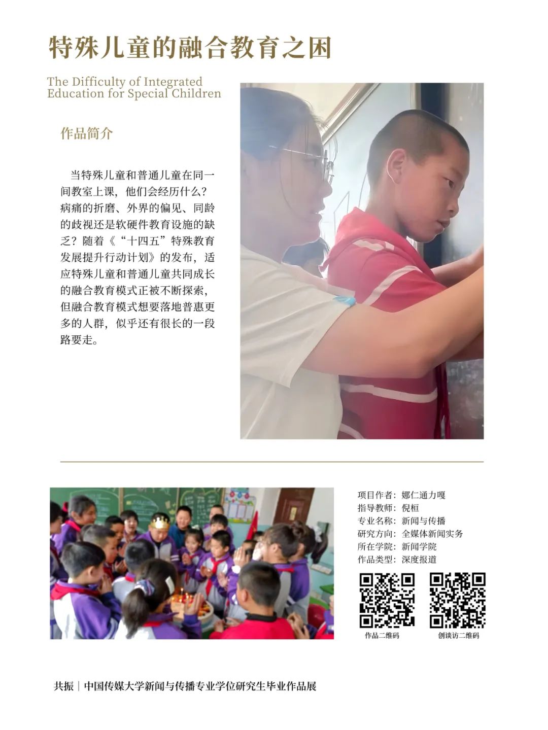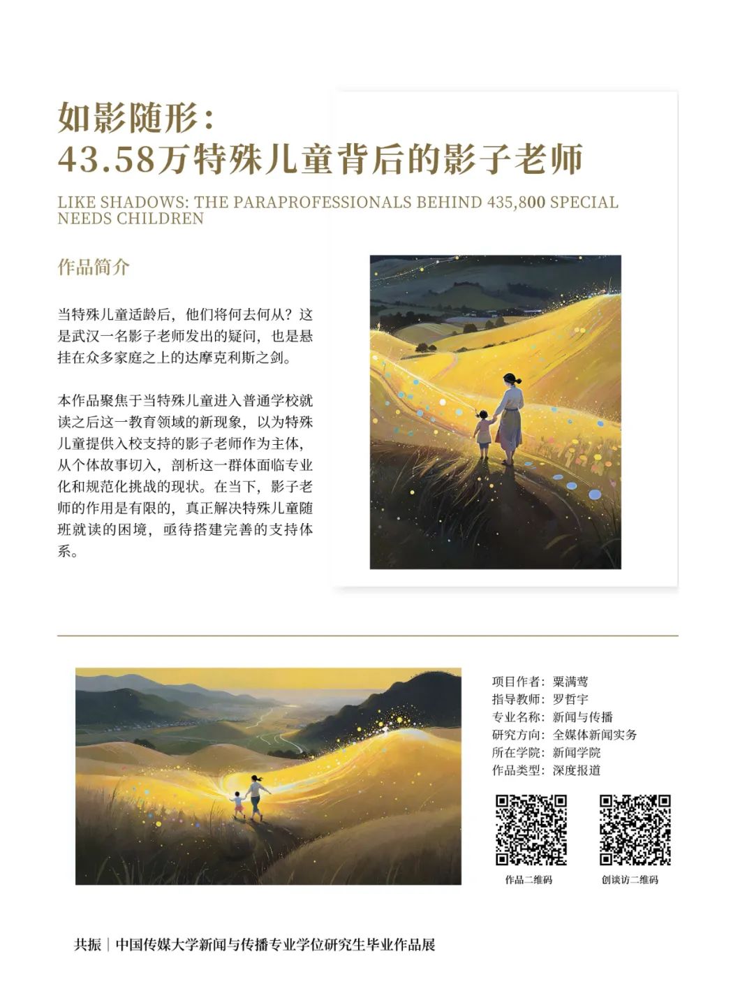 本作品聚焦于当特殊儿童进入普通学校就读之后这一教育领域的新现象,以为特殊儿童提供入校支持的影子老师作为主体,从个体故事切入,剖析这一群体面临专业化和规范化挑战的现状。在当下,影子老师的作用是有限的,真正解决特殊儿童随班就读的困境,亟待搭建完善的支持体系。